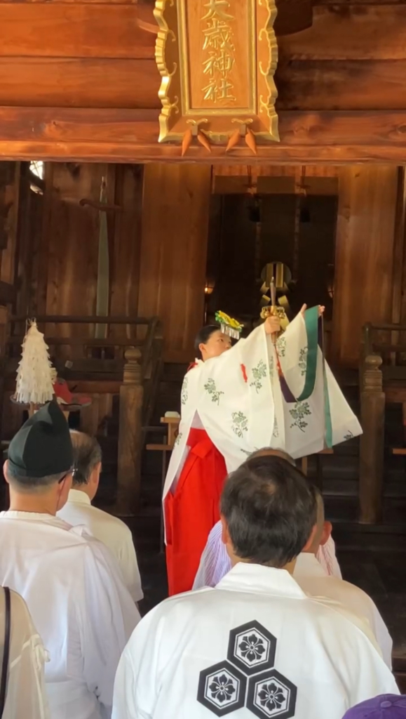 午後1時から大歳神社秋祭り祭典が執り行われました。飯田宮司による祝詞、玉串奉奠など、祭典の次第が厳かに執り行われる中、今年は久しぶりに巫女舞が奉奏されました。「浦安の舞」を奉奏してくれたのは石川未波さん(高3)。コロナ禍以降、男性だけになっていた祭典ですが、地元女子高生の頑張りで平安の雅(みやび)さや優美さを取り戻したことはとても喜ばしいことです。巫女舞を見に来ていた女子中学生が私も巫女になりたいと興味を持っていました。未波さんの地元を想う頑張りが波紋のように青少年の皆さんに広がってゆけばいいなと思います。
