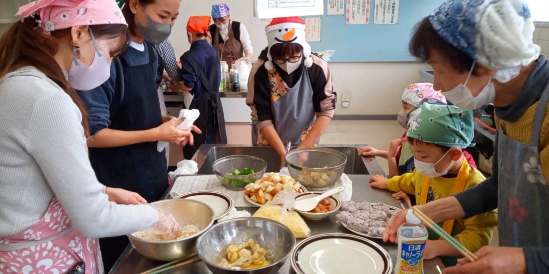 幼児から保護者、またいつもの「きずな食堂」のスタッフ。みんなで調理し、楽しく食べて、和気あいあいムードの中で楽しいひと時を共有しました。